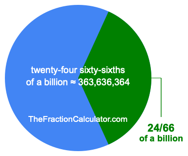 Therefore, 24/66 of a billion is the quotient of one billion divided by 66, multiplied by 24. Here is the math and the answer: