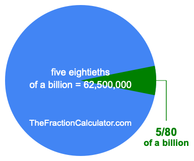 Therefore, 5/80 of a billion is the quotient of one billion divided by 80, multiplied by 5. Here is the math and the answer: