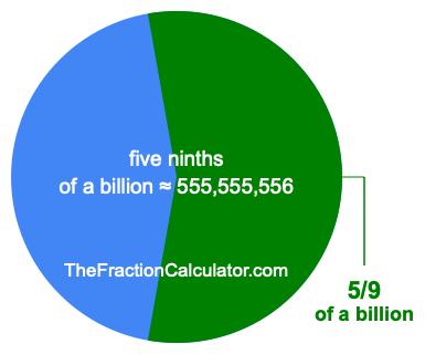 Therefore, 5/9 of a billion is the quotient of one billion divided by 9, multiplied by 5. Here is the math and the answer: