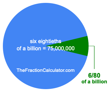 Therefore, 6/80 of a billion is the quotient of one billion divided by 80, multiplied by 6. Here is the math and the answer: