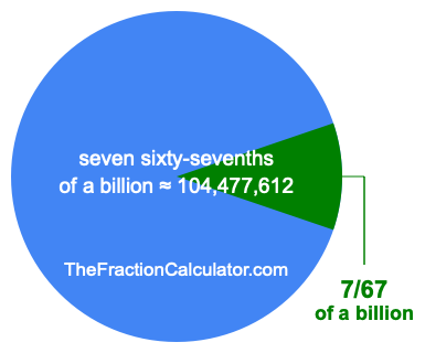 Therefore, 7/67 of a billion is the quotient of one billion divided by 67, multiplied by 7. Here is the math and the answer: