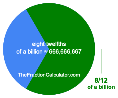 Therefore, 8/12 of a billion is the quotient of one billion divided by 12, multiplied by 8. Here is the math and the answer: