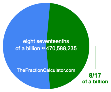 Therefore, 8/17 of a billion is the quotient of one billion divided by 17, multiplied by 8. Here is the math and the answer: