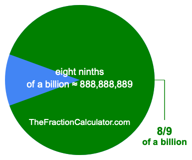 Therefore, 8/9 of a billion is the quotient of one billion divided by 9, multiplied by 8. Here is the math and the answer: