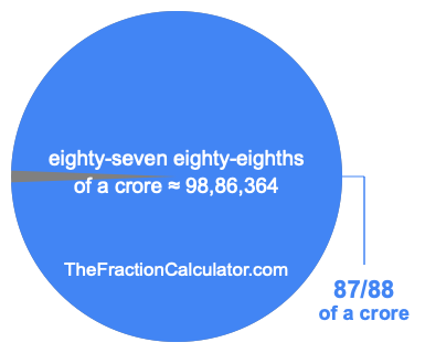 If you want to calculate 87/88 of a crore (eighty-seven eighty-eighths of a crore), then you want to divide one crore (1,00,00,000) into 88 equal pieces and calculate the sum of 87 of those pieces.
