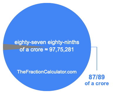 If you want to calculate 87/89 of a crore (eighty-seven eighty-ninths of a crore), then you want to divide one crore (1,00,00,000) into 89 equal pieces and calculate the sum of 87 of those pieces.