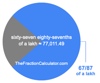 If you want to calculate 67/87 of a lakh (sixty-seven eighty-sevenths of a lakh), then you want to divide one lakh (1,00,000) into 87 equal pieces and calculate the sum of 67 of those pieces.