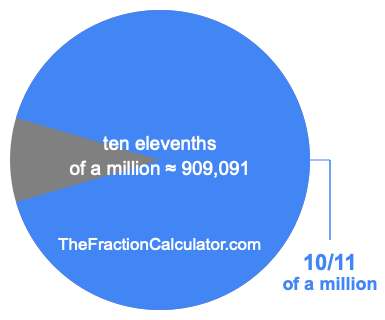 Therefore, 10/11 of a million is the quotient of one million divided by 11, multiplied by 10. Here is the math and the answer: