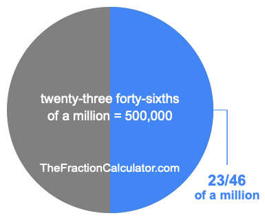 Therefore, 23/46 of a million is the quotient of one million divided by 46, multiplied by 23. Here is the math and the answer: