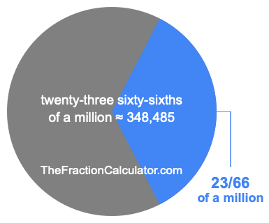 Therefore, 23/66 of a million is the quotient of one million divided by 66, multiplied by 23. Here is the math and the answer: