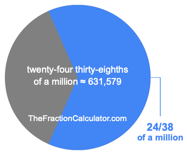 Therefore, 24/38 of a million is the quotient of one million divided by 38, multiplied by 24. Here is the math and the answer:
