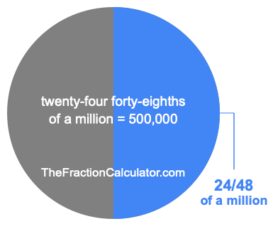Therefore, 24/48 of a million is the quotient of one million divided by 48, multiplied by 24. Here is the math and the answer: