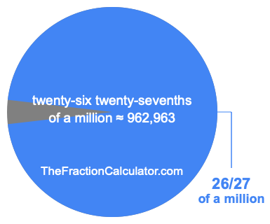 Therefore, 26/27 of a million is the quotient of one million divided by 27, multiplied by 26. Here is the math and the answer: