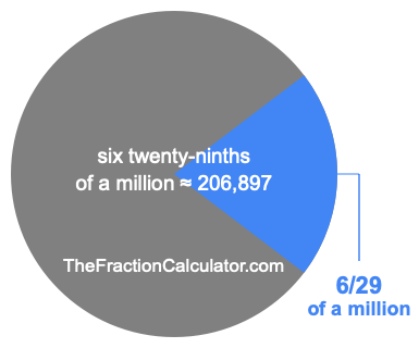 Therefore, 6/29 of a million is the quotient of one million divided by 29, multiplied by 6. Here is the math and the answer: