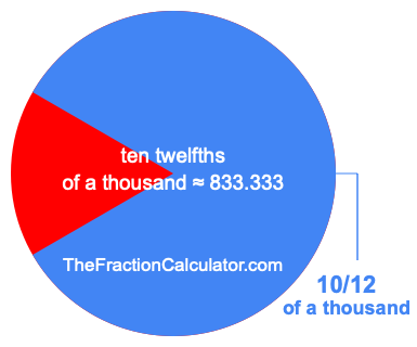 Therefore, 10/12 of a thousand is the quotient of one thousand divided by 12, multiplied by 10. Here is the math and the answer: