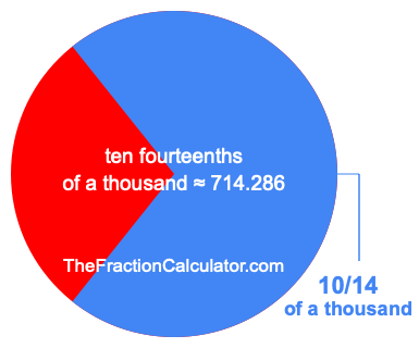 Therefore, 10/14 of a thousand is the quotient of one thousand divided by 14, multiplied by 10. Here is the math and the answer: