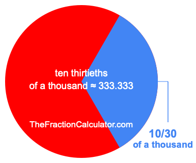 Therefore, 10/30 of a thousand is the quotient of one thousand divided by 30, multiplied by 10. Here is the math and the answer: