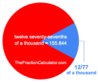 Therefore, 12/77 of a thousand is the quotient of one thousand divided by 77, multiplied by 12. Here is the math and the answer: