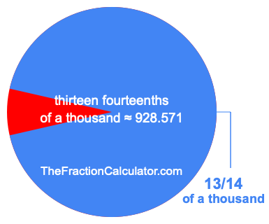 Therefore, 13/14 of a thousand is the quotient of one thousand divided by 14, multiplied by 13. Here is the math and the answer: