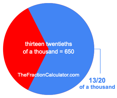 Therefore, 13/20 of a thousand is the quotient of one thousand divided by 20, multiplied by 13. Here is the math and the answer:
