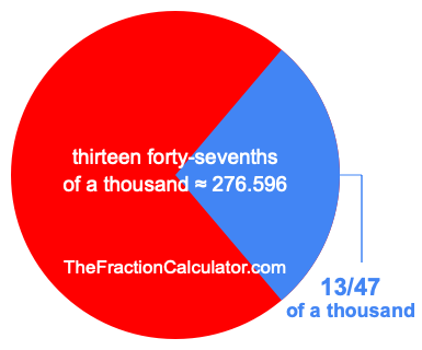Therefore, 13/47 of a thousand is the quotient of one thousand divided by 47, multiplied by 13. Here is the math and the answer: