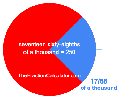 Therefore, 17/68 of a thousand is the quotient of one thousand divided by 68, multiplied by 17. Here is the math and the answer:
