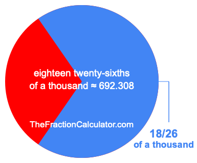 Therefore, 18/26 of a thousand is the quotient of one thousand divided by 26, multiplied by 18. Here is the math and the answer: