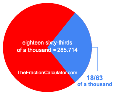 Therefore, 18/63 of a thousand is the quotient of one thousand divided by 63, multiplied by 18. Here is the math and the answer: