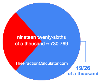 Therefore, 19/26 of a thousand is the quotient of one thousand divided by 26, multiplied by 19. Here is the math and the answer: