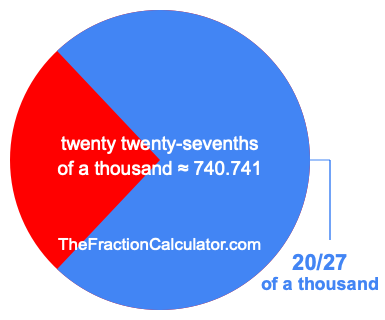 Therefore, 20/27 of a thousand is the quotient of one thousand divided by 27, multiplied by 20. Here is the math and the answer: