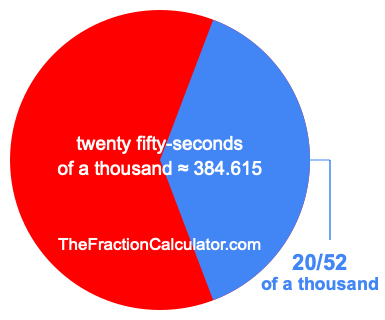 Therefore, 20/52 of a thousand is the quotient of one thousand divided by 52, multiplied by 20. Here is the math and the answer: