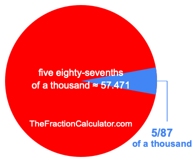 Therefore, 5/87 of a thousand is the quotient of one thousand divided by 87, multiplied by 5. Here is the math and the answer: