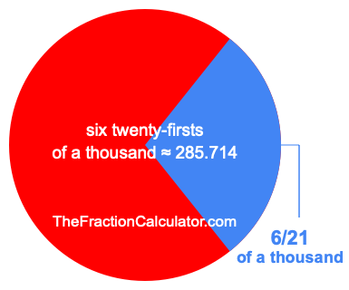 Therefore, 6/21 of a thousand is the quotient of one thousand divided by 21, multiplied by 6. Here is the math and the answer: