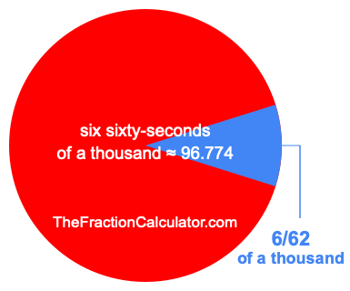 Therefore, 6/62 of a thousand is the quotient of one thousand divided by 62, multiplied by 6. Here is the math and the answer: