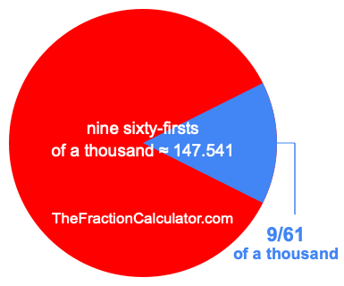 Therefore, 9/61 of a thousand is the quotient of one thousand divided by 61, multiplied by 9. Here is the math and the answer: