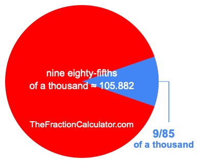 Therefore, 9/85 of a thousand is the quotient of one thousand divided by 85, multiplied by 9. Here is the math and the answer: